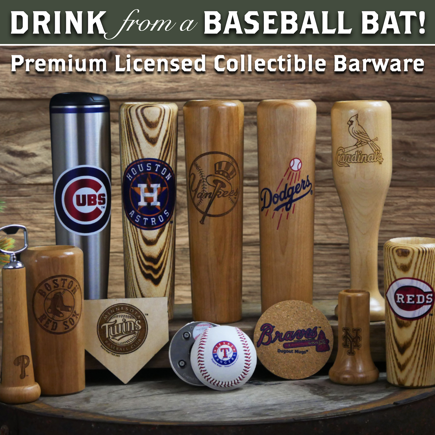 Click below and you can score FOUR of our most popular products for ONE low price! Just $99 gets you a Flagship Dugout Mug, a Bat Handle Opener, a Bat-Slice Keychain, and a set of 4 Home Plate Wooden Coasters... ALL with your favorite teams logo!