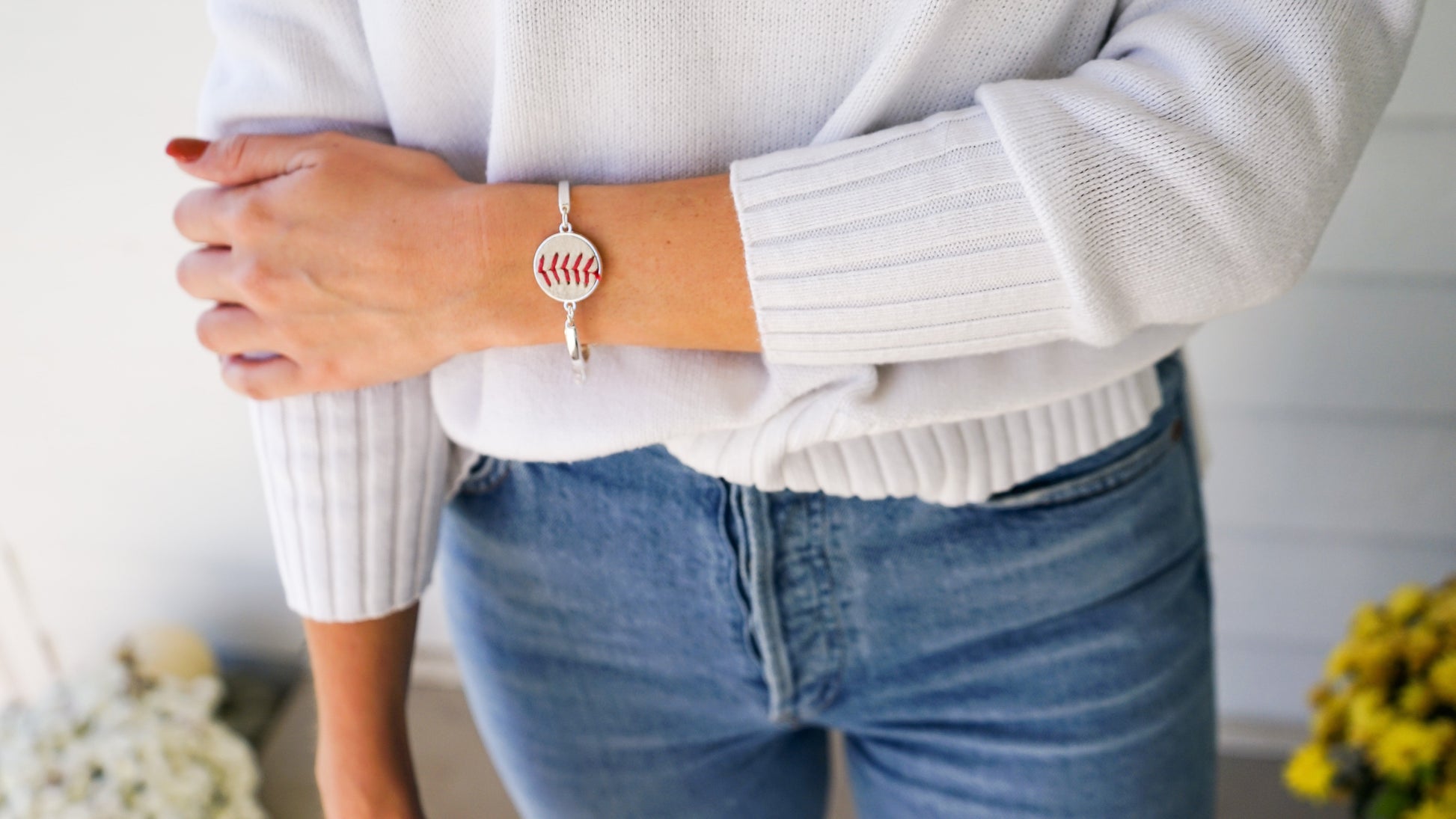 The baseball pendant on top is 20mm in diameter and the lobster clasp makes the bracelet adjustable in width. Bracelet metal is made of zinc alloy and is lead and nickel free. Please note that this is fashion jewelry. Do not wear bracelet in or submerge in water.